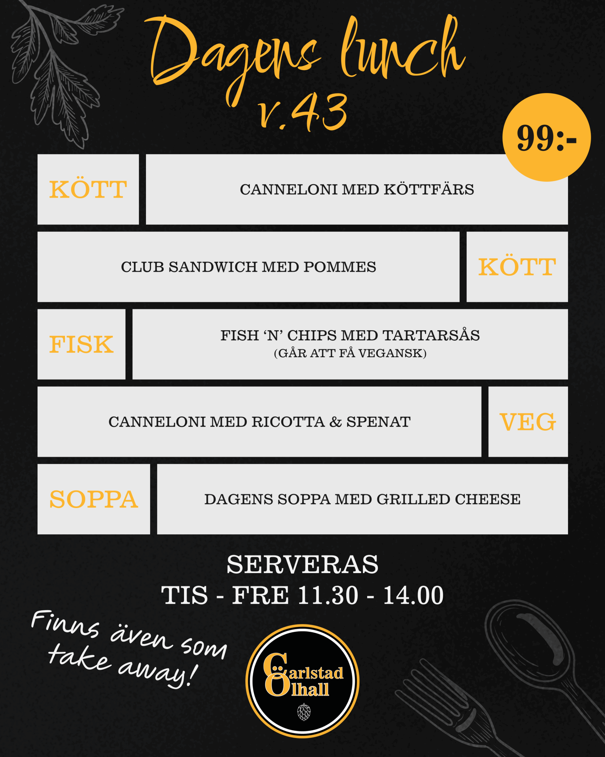 Matmenyn är Svensk husmanskost med twist, där all mat lagas från grunden och med fokus på lokala råvaror, menyn är enkel, välsmakande och mättande.