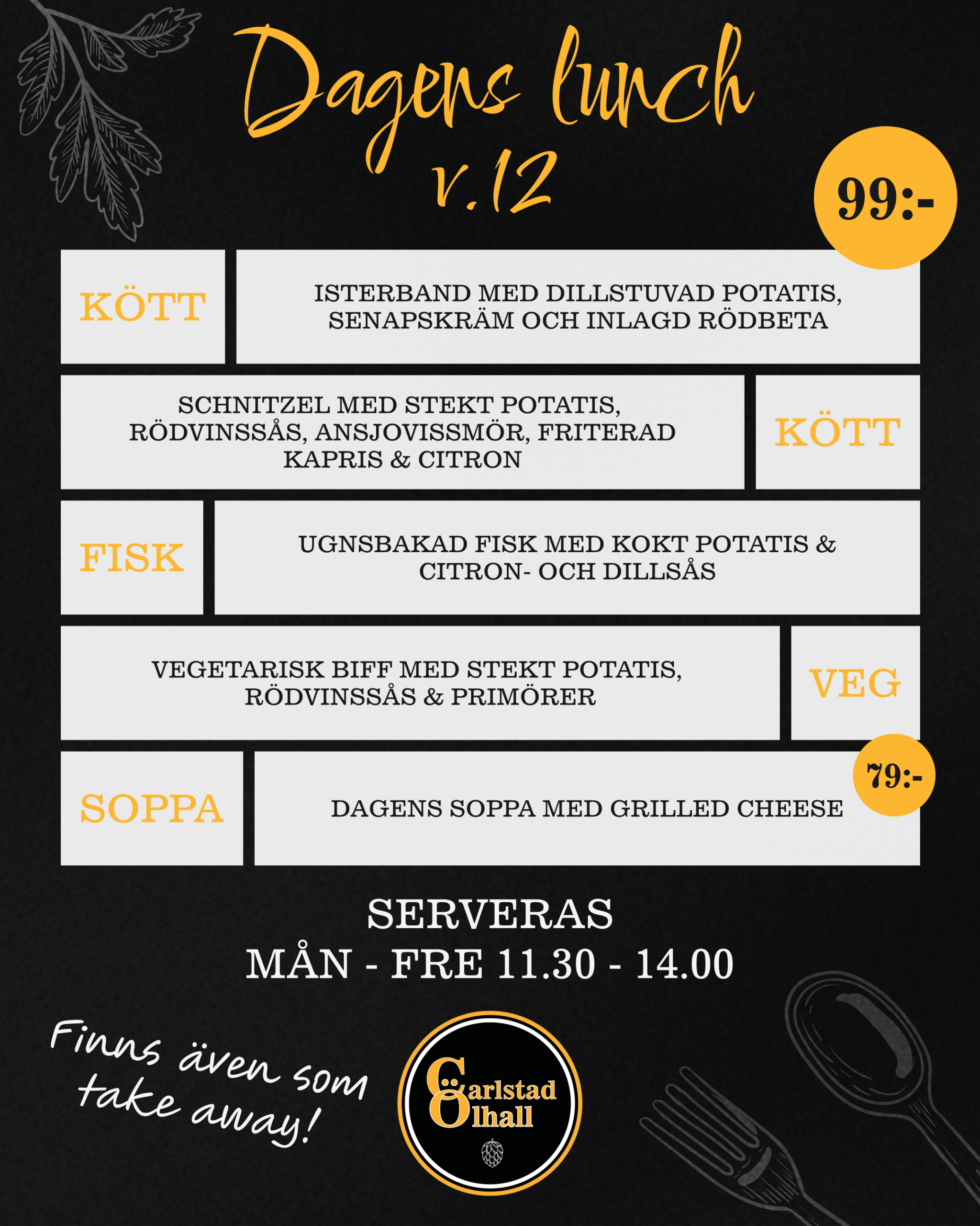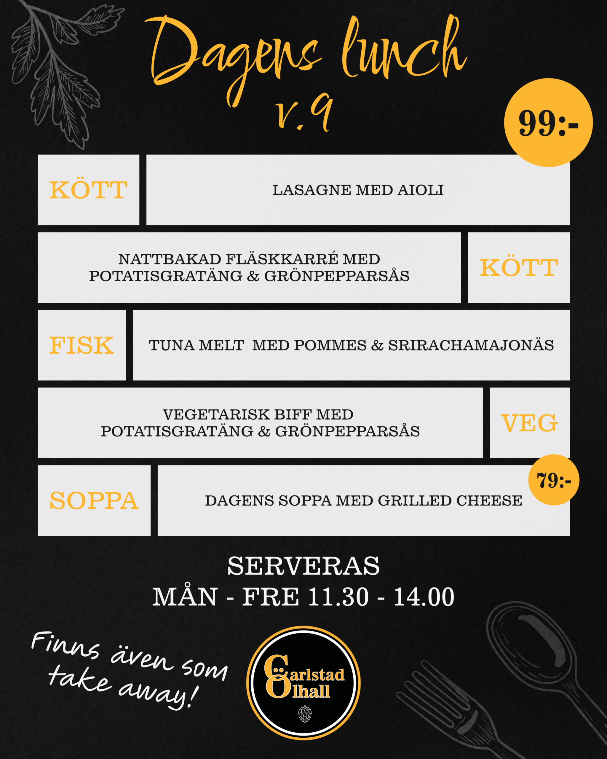 Matmenyn är svensk husmanskost med twist, där all mat lagas från grunden och med fokus på lokala råvaror, menyn är enkel, välsmakande och mättande.